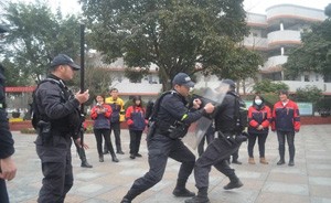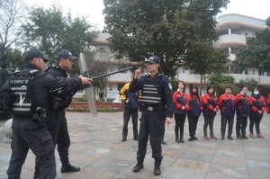 其次,大邑县公安局特巡警大队副队长王显强从护校队员防暴防恐的要求、突发事件的应急处置等方面进行了培训,并对防暴防恐中刀叉、盾牌等器械的正确使用进行了演示,他强调: “遇到突发事件首先要报警,在防暴防恐中,护校队员要以2人或者3人形成防御最小单元,盾牌要双手牢固掌握,双脚要分开弓步站立,在行进中要厉声威吓……”听了王队长的详细讲解,大家纷纷表示,培训演练学到了知识,加深了对校园安全的认识,要以高度的责任感和规范的操作、专业的技能,为全体师生筑牢校园安全防线,确保校园平安。