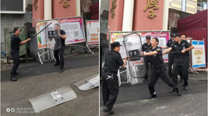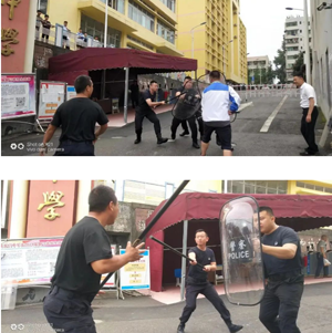 李红强现场指导保安人员利用盾牌、警棍、腰叉等防暴器械联合制服持械歹徒。