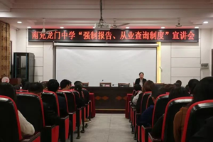 为扎实推进学校未成年人保护工作,增强全体教职员工、临聘人员的法治观念,营造良好的法治校园氛围,助力法治校园建设,31日下午,南充市人民检察院党组副书记、常务副检察长、学校法治副校长唐蔚和市检察院第七检察部主任张莉带领法治宣讲团走进四川省南充龙门中学,为全校工作人员宣讲强制报告与从业查询制度。宣讲会由学校工会主席万彩霞主持。