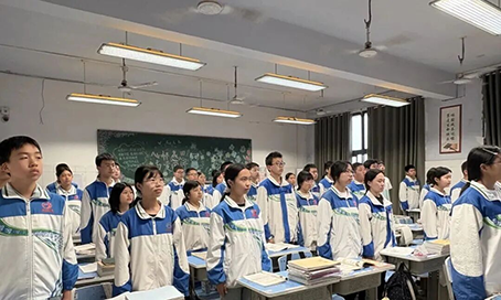 周一清晨,室外阴雨绵绵,教室内气氛庄重而热烈。伴随着雄壮的旋律,全体学生肃立高唱国歌,用嘹亮的歌声表达对祖国的热爱与崇敬。