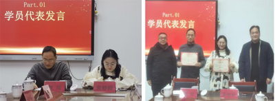 典礼伊始,优秀学员代表张婷婷和刘川上台发言,他们深情回顾了20天培训中的成长与收获,从数字化教学资源的掌握到项目教学法的运用,从班级管理的学习到教科研的探索,字里行间满是对知识的汲取和对未来教学的展望,引起了在场学员的强烈共鸣。随后,校长范文辉和副校长叶启华为两位优秀学员颁发荣誉证书,表彰他们在培训期间的优异表现,激励全体学员奋勇争先。