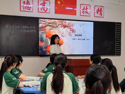 工作室青年成员简丽芳老师精心挑选了毛泽东的四首诗词,带着学生采用“听-读-析”的教学,为大家展示了诗词赏析的方法。课中她营造浓厚的情感氛围,采用多样化的诵读方式,让学生在诵读中感受毛泽东诗词的磅礴气势和革命情怀,实现了语文教学与课程思政的有效融合。