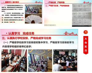 7月12至14日,白塔中学东湖校区认真执行学校安排,扎实开展暑期政治学习暨师德师风专题教育,深入学习了《南充市高坪区“百年白中再续辉煌”三年行动方案》和陈多平书记讲话精神,圆满完成了各项学习任务。
