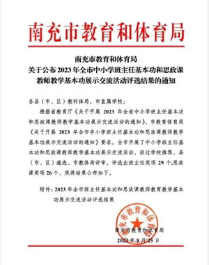 在2023年南充市中小学班主任基本功和思政课教师基本功大赛中,四川省南充市白塔中学郭玲筠老师荣获“班主任基本功”一等奖;黎涵老师荣获“思政课教师教学基本功”一等奖。