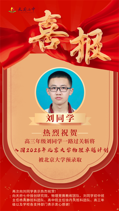 近日,北京大学招生网发布了“物理卓越计划”查询通知,我校高三年级刘同学入围2025年北京大学物理卓越计划。这是2024-2025年度,继李木易、舒源后,第三位被北大预录取的天七学子,同时也是我校在拔尖创新人才培养上取得的又一突破!