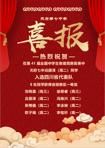 近日,物理竞赛团队捷报频传,在第41届全国中学生物理竞赛四川赛区复赛中,天府七中高二高三7名竞赛同学全部获省一等奖,无一人落榜,其中高二吕朋泽同学入选省队,实现物理学科竞赛历史突破!高一李铭轩同学首次参赛即获得省级赛区一等奖。