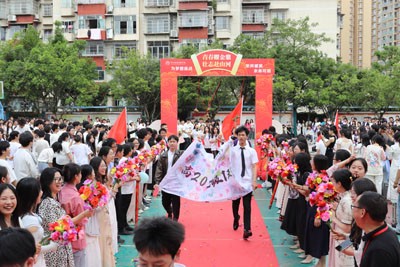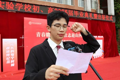 学生代表胡灵达以“十八岁的白纸”为喻,感恩师长用粉笔灰晕染知识山河,致敬同窗以纸条传递纯粹情谊:“那些草稿纸上的算式、深夜台灯下的坚持,是我们为梦想孤注一掷的勇者勋章!”校长甘川邻寄语学子破茧成蝶:“中考高考是蜕变的契机,请带着从容与自信,让每一笔落纸都绽放梦想之光!”