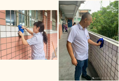 校园里,一派热火朝天的劳动景象令人动容。党员教师们躬身示范,不仅指导学生如何劳动,更用实际行动诠释着责任与担当。年轻党员教师罗老师边擦拭门窗边对学生说:“把校园打扫得干干净净,就是我们献给祖国最好的生日礼物。”