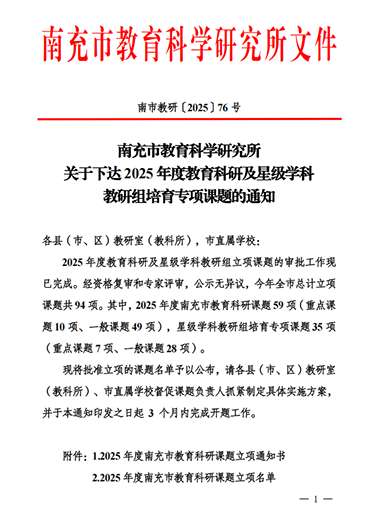 近日,南充市2025年度教育科研及星级学科教研组培育专项拟立项课题名单揭晓,南充龙门中学3项课题凭借扎实的研究基础、创新的研究视角成功立项。
