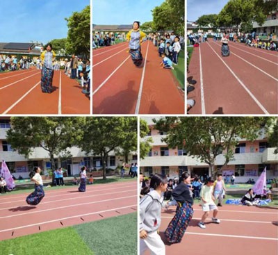 运动会上,同学们在20米袋鼠跳接力赛中默契传递、活力跃动;班级篮球比赛里团队协作、攻防尽显;跳绳项目中短绳竞速计数亮眼、8字跳绳全员协作挑战极限;武术操表演整齐划一、气势昂扬;投飞镖专注瞄准、稳健命中;投沙包、实心球蓄力挥臂、展现力量;仰卧起坐坚持到底、突破自我;两人三足绑腿同行、配合无间,各项目均展现出优异实力与拼搏风采。