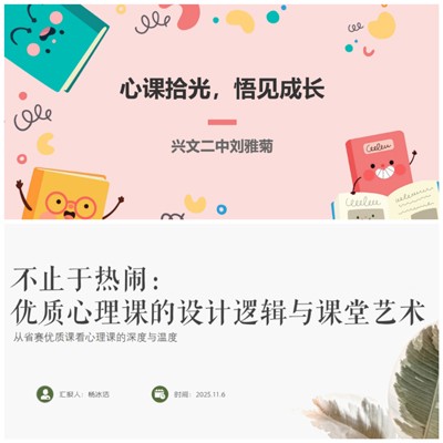 培训中,兴文二中刘雅菊老师带来了题为《心课拾光,悟见成长》的专题培训,刘老师聚焦第一展评会场优质课,从课程设计、教学策略应用、学生反馈等方面展开分享,呈现了12节优质课堂的构建逻辑与实施路径,同时为老师们提供了观摩优质课的三维学习路径。紧接着,兴文中学杨冰洁老师以《不止于热闹:优质心理课的设计逻辑与课堂艺术》为题,围绕“选题—理论—活动”三个维度对第二展评会场优秀成果进行解读,重点解析了“八卦有门道”“被讨厌的勇气”“遇见自己”三节优质课的教学设计和课堂效果,并精心提炼出了心育课程的核心逻辑:情境激活、外化感受、认知重构和整合内化。最后,杨老师趁热打铁的感悟——“准、深、清”为此次培训画上了完美的句号。