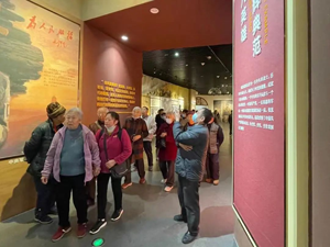 老同志们参观到第五展厅,驻足在刻写有毛泽东同志所著《为人民服务》全文展板前,不由自主地朗读起来:“我们的共产党和共产党所领导的八路军、新四军,是革命的队伍。我们这个队伍完全是为着解放人民的,是彻底地为人民的利益工作的……。”大家动情地议论起来。老党员张安德说:“啥叫为人民服务?正如毛主席所说彻底地为人民的利益工作就是很好的为人民服务。”老党员胡素珍腿脚不便,仍坚持参观完所有展厅,她说:“我们过去在讲台上认真教书育人,无私奉献,很好地践行了为人民服务;现在虽年过古稀,我们也要影响身边人,不能忘记我们党的这一宗旨!”大家纷纷表示,党的二十大坚持以人民为中心的发展思想,体现了党的理想信念、性质宗旨、初心使命,也是对党的奋斗历程和实践经验的深刻总结。在今天奋斗新时代、奋进新征程中,我们老共产党员一定要大力弘扬张思德精神,坚持全心全意为人民服务的根本宗旨,践行以人民为中心的发展思想,努力为实现人民美好生活而发挥余热。随后,大家回到正厅张思德铜像前,列好队,展开鲜艳的党旗,举起紧握的右拳,重温入党誓词:“我自愿加入中国共产党,拥护党的纲领……永不叛党。”庄严的誓言在大厅中回响。