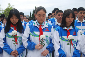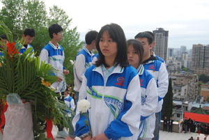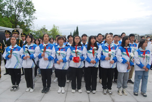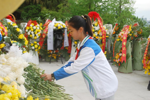 在青松翠柏的映衬下,革命烈士纪念碑显得格外庄严肃穆。团(队)员代表敬献花篮,他们以无限的悲哀,编成洁白的花环,献给敬爱的英烈,告慰英雄的忠魂。接着,全体师生向烈士行三鞠躬礼,以表达深深的敬意和无限的哀思。