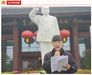 在朱德同志庄严肃穆的雕像下,张莉梅同志为全体党员上了题为《缅怀革命先辈,汲取奋进力量》的党课。她指出,我们要学习和继承朱德同志的宝贵精神,一是要学习他无限忠诚、光明磊落的坚强党性;二是要学习他一生学习、一生向前的奋斗精神;三是要学习他实事求是、求真务实的思想方法。全体人员认真聆听,深刻感悟朱德精神,深切缅怀朱德功勋。