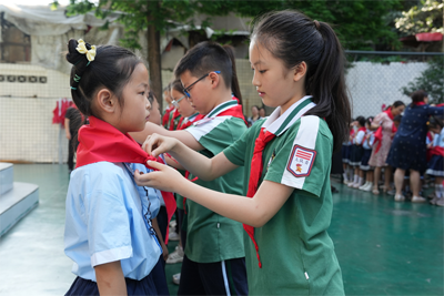 少先队大队长宣读了批准新队员入队的决定,这一时刻,对于新队员们来说意义重大,标志着他们正式成为了光荣的少先队员。接着,老队员们手捧红领巾,迈着整齐的步伐走向新队员,为他们佩戴上象征荣誉与责任的红领巾。新老队员互敬队礼,这一庄重的礼仪,传递着少先队的精神与使命,也承载着老队员对新队员的期望与祝福 。