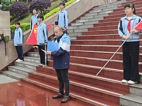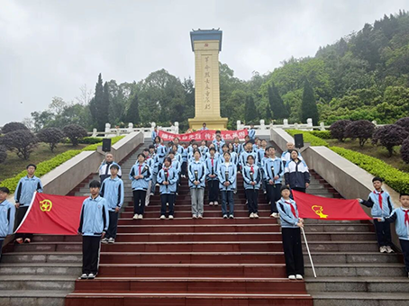 来到烈士陵园,全体师生肃立,奏唱中华人民共和国国歌,激昂的歌声在陵园上空回荡。随后,为革命先烈默哀,表达对英烈的深切缅怀与无限敬仰。学生代表登台发言,抒发对先烈的追思与崇敬,立志以英烈精神激励自我,奋勇前行。副校长易文在讲话中寄语同学们,要铭记革命先烈的丰功伟绩,传承和弘扬英烈的爱国主义精神,将红色基因融入血脉,把哀思化为动力,努力成长为有理想、有道德、有文化、有纪律的新时代少年。