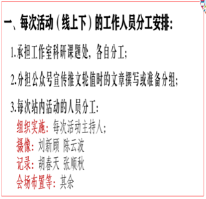会议伊始,工作站负责人赵华群老师就成员加入“‘家庭教育指导’教学”刘育聪名师工作室内江工作站后,每项每次活动工作人员分工安排进行了总体介绍和说明,如本工作站承担工作室科研课题处工作及各自分工; 轮值公众号宣传推文时的活动工作简报和文章撰写分组安排; 每次站内活动的人员分工安排等。