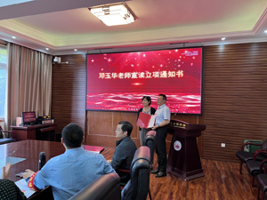 成都市高中化学教研员邓玉华宣读市级课题立项通知书,并颁发证书。党总支书记、课题负责人李华清接受证书。