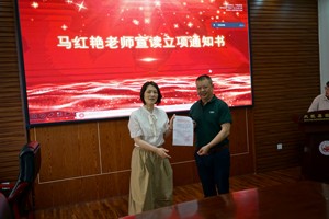 四川省教育科学研究院、高中化学教研员、课题总负责人马红艳,为学校宣读课题立项通知书并颁发证书。张家智校长接受证书。