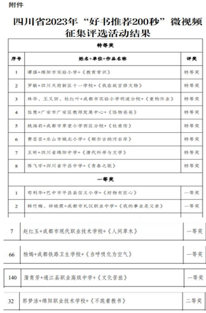 为大力提升教师专业素养,助力推进全民阅读,构建书香社会,四川省傅洪成名师工作室积极响应四川省教育学会、四川省教师发展中心的号召,开展了“好书推荐200秒”微视频制作活动。经工作室审核,共推荐19件作品参加省上的此次活动。6月6日,评审活动结果揭晓,工作室获奖作品共计13件。赵红玉、杨嫣、蒲育芳等3位老师的作品获得一等奖,郭梦洁、雷丹蕊、周春丽、阳建琼、李秋梅、明安丽 等6位老师的作品获二等奖,米肖佳、薛梅梅、刘盈、邬家洪等4位老师的作品获三等奖,活动取得丰硕成果。