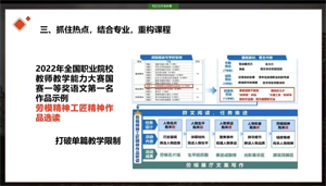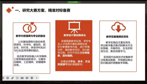 戴志敏老师结合近年来教师技能大赛获奖案例,从“研究大赛方案,精准对标备赛”“立足课程标准,开展专题教学”“抓住时事热点,结合专业重构课程”等三个方面指导参会教师精准备赛,提出“重点创新三大策略”开拓教师教学设计思路,并勉励教师潜心备战省赛决赛,凝心聚力做好比赛。