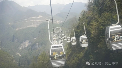在画架沟,同学们坐上缆车,沿着宛如游龙的索道,穿林渡水。云遮雾绕的优美风光令人心旷神怡。