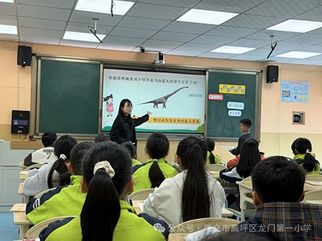 袁子鸿老师执教四年级下册说明文《飞向蓝天的恐龙》。课堂上,袁老师教态亲切自然,语言富有感染力。她紧扣教学目标,精准把握教学重难点,灵活运用默读、分组讨论、学生自学等多种教学方法,层层递进,引导学生深入理解文本内容。学生们在自主探究与合作交流中积极思考,课堂氛围活跃,学习兴趣浓厚。