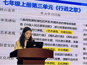 随后,我校李奇燃老师以七年级上册第三单元《行进之歌》为例,作了“课标引航·教材筑基·学情启思”的专题分享。