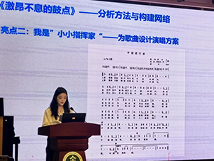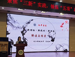 九江新城初级中学李德琳老师则以七年级下册第五单元《天山之音》为范本,分享了她对新教材的探索。她通过“听赏与述评”“独唱与合作演唱”“编创与展示”的任务设计,精准把握单元的人文主题与音乐知识主线。通过引导学生感受新疆音乐的节奏与旋律特点,将民族文化认同教育自然融入音乐实践,展示了如何从“教教材”走向“用教材教”的深度挖掘。