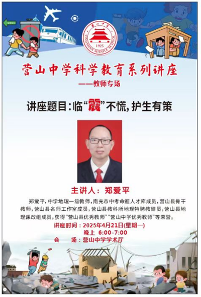 四月的校园,春风拂过求知的面庞,科学之光点亮生命的智慧。4月21日傍晚,四川省营山中学学术厅内,一场关于生命守护与教育使命的对话如约而至。当防震减灾的实践智慧与科学育人的教育理念相遇,我们以专业为舟,以责任为帆,共赴一场守护生命的航行。