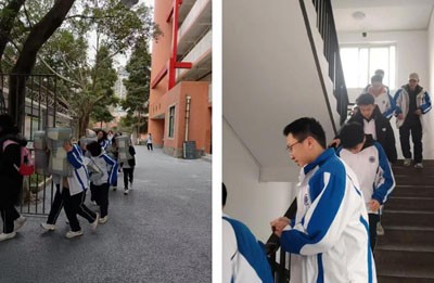 14时整,模拟地震警报骤然响起,全体住校生立即采取标准避震姿势,就近躲避至桌椅三角区。主震结束后,学生在楼层引导员指挥下,双手护头沿指定路线快速撤离,迅速抵达操场集合点。各年级现场清点人数,确认全员到齐。