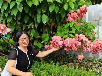 素兰十分偏爱粉纸扇花,每见必拍,走到红花山公园,见园林工人在把她心爱花儿剪下来掷在地上。因为此花在工人们看来已经过季。她大为惊讶,心疼地一一捡起,爱不释手。甚至想带两支回去扦插,后来发现办不到。只好摆拍一番,恋恋而去。