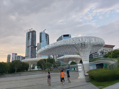 大家被街头那些极具个性,绝不重样的建筑吸引,一路上只顾拍拍拍。从前卫的摩天大楼到生态建筑,从历史街区再到充满烟火气息的大排档。即便是咖啡馆的一堵墙,广场上的装饰形建筑,都既融合了国际前沿设计理念、又有中国风,兼具环保理念。既有小桥流水,竹篱茅舍的感觉,又有圆顶,尖顶,异形带来的视觉冲击,还有世界各地的建筑因素。