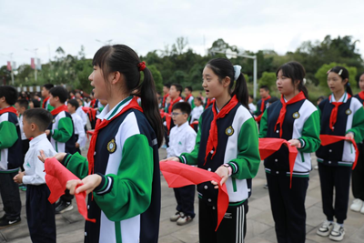 活动在激昂的《出旗曲》中拉开序幕,全体少先队员身着整齐校服,高唱《中国少年先锋队队歌》,嘹亮的歌声回荡校园,展现出新时代少年昂扬向上的精神风貌。少先队大队长刘奕伶同学郑重宣布新队员名单,在热烈的掌声中,市教育科技和体育局、学校领导及少先队员代表为80名新队员佩戴上鲜艳的红领巾。这抹象征光荣与责任的红色,在新队员胸前飘扬,标志着红色基因的接力传承。