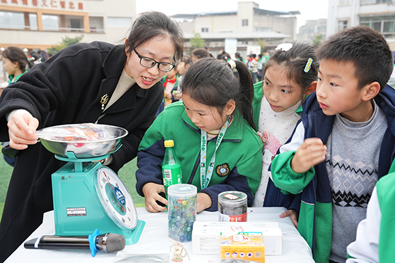 活动设置三大沉浸式挑战项目,点燃学生探索热情。“慧眼估重王”以直观展示结合实操体验,强化学生对质量单位的认知,同步提升观察与估算能力;“答题挑战”围绕质量单位换算、等量代换知识及曹冲称象经典故事设计,检验知识掌握度,锤炼知识运用与快速反应能力;“智慧售卖区”由13个班级搭建特色零食摊位,配备精准称量工具,学生化身摊主与买家穿梭其间,在买卖互动中实操称量计算,提升实践操作与生活应用素养。