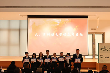 随后,八位学科组长依次登台,宣读各组的奋斗目标。学科组的老师们也用阵阵哨声回应,这哨声是支持,是自信,也是冲锋的号角。