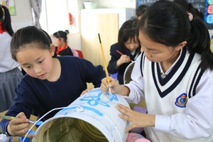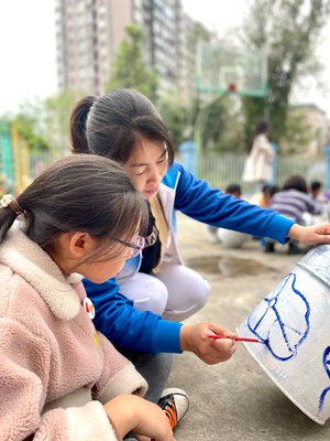 美术社团的孩子大显身手——让柔美高雅的青花瓷与油漆桶碰撞,将操场绿色种植区这道风景线装点得唯美浪漫!