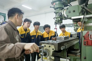 2022年11月9日,四川省华蓥市恒格光电仪器厂的技师在设于车间的课堂,给该市职业教育培训中心的学生现场讲解机械的操作技术。