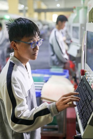 2022年11月9日,四川省华蓥市坤鸿电子厂的技师在设于车间的课堂,给该市职业教育培训中心的学生现场讲解机械的操作技术。