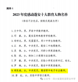 由蓬安县教育科技和体育局组织开展的2023年度感动蓬安十大教育人物评选活动,经过社会推荐、网络投票和评委评议等程序,四川省蓬安职业中学教师胡良春被评选为“2023年度感动蓬安十大教育人物”。