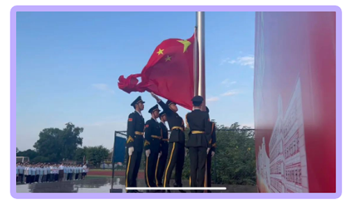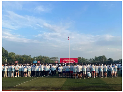 伴着朝阳,开学典礼在庄严肃穆的升旗仪式中拉开帷幕,全校师生面向国旗,奏唱国歌,行注目礼。