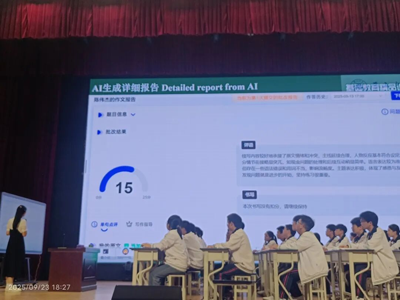活动开篇,英语组王娟老师带来AI融合创新示范课。她以英语读后续写为教学载体,让在场教师直观感受到AI技术在学科教学中的实用价值。课堂上,王老师借助AI工具构建了“精准诊断—智能优化—靶向提升”的教学闭环,通过AI系统对学生的读后续写作业进行自动化评分,快速生成包含语法错误、逻辑衔接、内容创意等维度的详细分析报告;随后针对学生写作中的共性问题,利用AI功能生成个性化修改建议;最后结合AI反馈的薄弱知识点,设计针对性练习,帮助学生精准突破学习瓶颈。整个教学过程逻辑清晰、实操性强,为不同学科教师如何将AI融入日常教学提供了可复制、可推广的鲜活范例,赢得了现场教师的广泛认可。