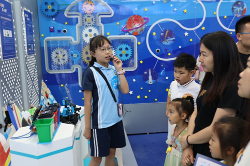 二是科技创新成果区。这里不仅展示了学校优秀的科技创新成果案例、科技调查活动、科技影像等,还展示了学生们很多新奇的创新成果,有智能家居系统的设计、有制作简易电路、有多功能智能雨伞、还有环保配色演示器等。每一件作品都凝聚着学生们的智慧和汗水,吸引着观展的人们驻足、思考。