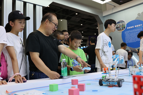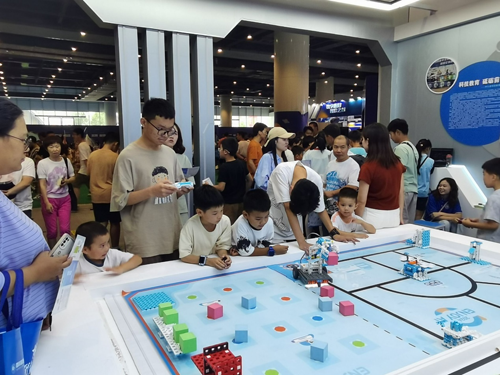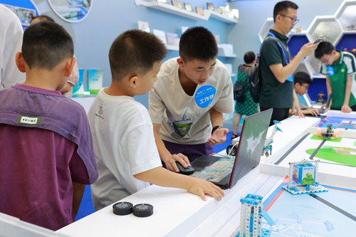 四是创新项目展示区。这里主要展示了三个学校的创新项目:中江县小南街小学校的“数据风暴”,操作者需要根据任务需求,编写程序代码块,下载到机器人,然后执行。中江县广福中学校展示的是ENJOYAI火星探险家挑战。中江县继光实验学校展示的是挑战Super AI超级轨迹虚拟机器人。