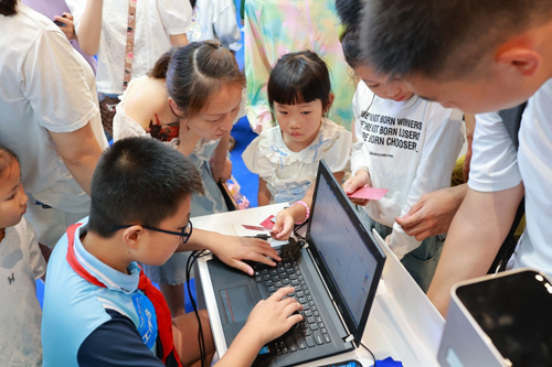 工作坊的顶面悬挂的是孩子们动手实践的航模,门口展示的激光雕刻,几秒钟就可以雕刻出想要的图片或文字。给自己定制一张个性化名片的活动现场异常火爆!