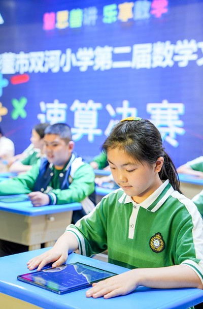 2025年5月7日,在四川省华蓥市双河小学举行的第二届数学文化节上,参加“速算决赛”项目的选手在认真思考。
