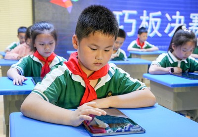 2025年5月7日,在四川省华蓥市双河小学举行的第二届数学文化节上,参加“聪明格决赛”项目的选手在认真答题。