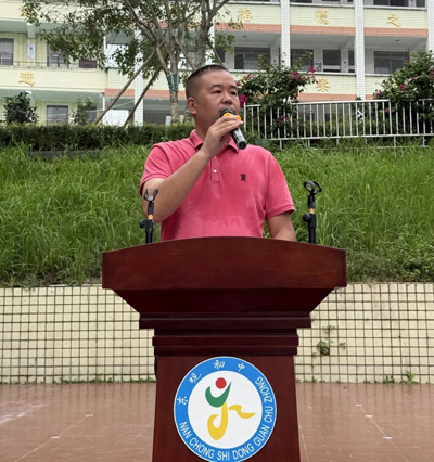 东观初中校长、党支部书记杨军为开学典礼致辞,杨校长先是代表学校对全体同学和家长表示热烈的欢迎,然后回顾了在过去一学期里,学校基础设施、校园风气和办学成果取得的可喜变化和骄人成绩。