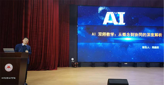上午11点,四川省校长协会和教学研培活动合二为一,参会老师共同在科教楼报告厅听取了成都师范学院教师教育学院院长周鑫燚的学术讲座,他讲座的题目是《AI双师教学:从概念到协同的深度解析》。