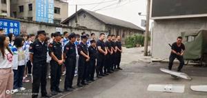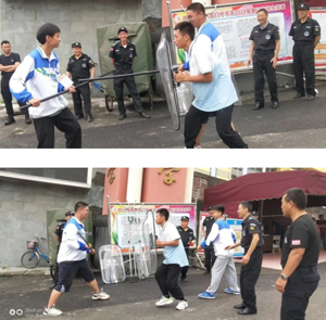 李红强现场指导保安人员利用盾牌、警棍、腰叉等防暴器械联合制服持械歹徒。